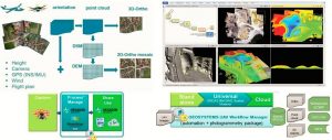 - Νέφος σημείων (point cloud), ψηφιακό μοντέλο επιφάνειας (DSM/DEM) και ορθοφωτομωσαϊκό (mosaic) της περιοχής ή του αντικειμένου ενδιαφέροντος κάνοντας χρήση των ληφθέντων εικόνων και των δεδομένων GPS/INS.